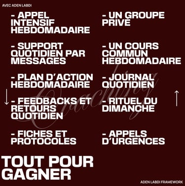 Cela inclut un appel individuel hebdomadaire, un support quotidien par messages, un plan d’action progressif sur tous les aspects (corps, mental, relations, business), et un feedback continu sur leurs actions afin de maintenir un suivi clair et précis.
